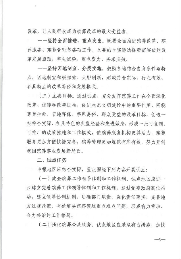 (三)主要目標(biāo)。通過試點,充分發(fā)揮殯葬工作在全面深化改革、保障和改善民生、促進(jìn)生態(tài)文明建設(shè)中的重要作用,圍繞尊重生命、節(jié)地環(huán)保、移風(fēng)易俗、群眾受益的改革目標(biāo),創(chuàng)造一批符合實際、各具特色的典型經(jīng)驗和先進(jìn)做法,形成一批可復(fù)制、可推廣的政策措施和工作模式,使殯葬服務(wù)機構(gòu)更具活力,殯葬服務(wù)更加方便快捷完備,殯葬管理更加規(guī)范有序有效,努力開創(chuàng)我國殯葬事業(yè)發(fā)展新局面。