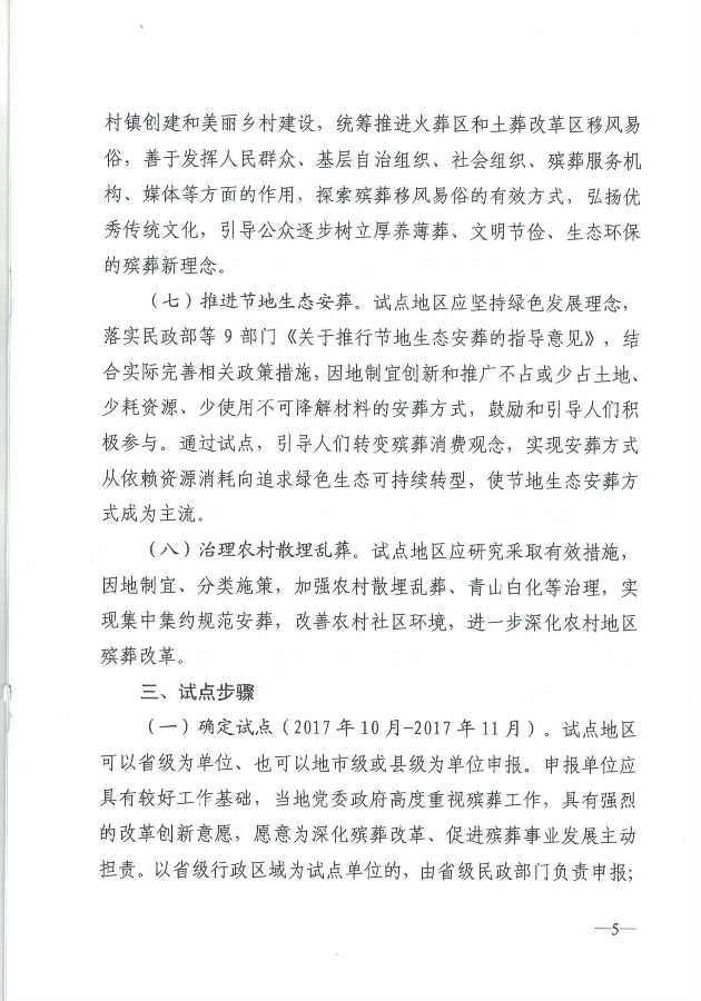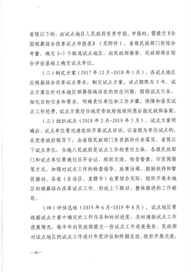 (二)制定方案(2017年12月-2018年1月)。各試點地區(qū)應(yīng)根據(jù)綜合改革試點要求,制定試點方案。試點期限為2年。試點方案應(yīng)針對本地區(qū)殯葬領(lǐng)域存在的突出問題,圍繞試點任務(wù),細(xì)化目標(biāo)任務(wù)和要求,明確責(zé)任單位和工作步驟,保障和落實試點工作經(jīng)費。試點方案經(jīng)當(dāng)?shù)攸h委政府批準(zhǔn)同意后報民政部備案。
