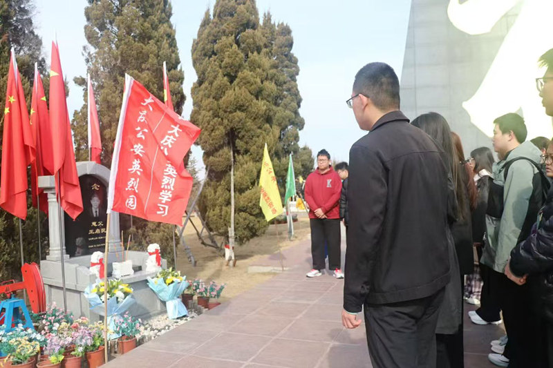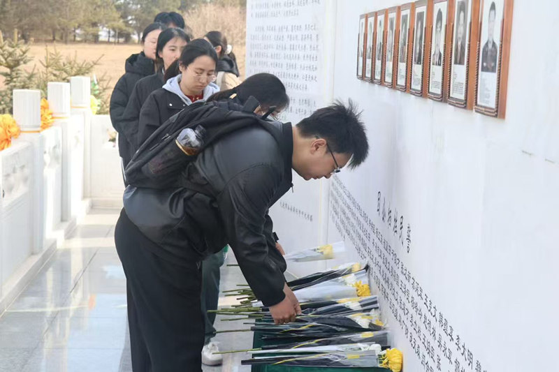 (2)師生們手持鮮花向大慶公安英烈默哀致敬,感恩時代英雄。